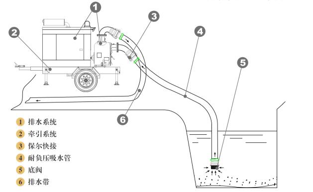 4、以活塞轉(zhuǎn)子泵取代常規(guī)應(yīng)用的離心泵作抽水作業(yè)。由于活塞轉(zhuǎn)子泵具有空氣、液體、固體同時混合輸送的特性,所以不用通過灌水來引水開機即可快速投入,同時不但可以輸送清水,還可以輸送帶雜質(zhì)的水和污水而不怕堵塞;由于具有吸程高(0~8m)、寬揚程(0~80m)、寬流量(0-1500m3/h)、自動調(diào)整揚程與流量的特性,所以在額定的功率范圍內(nèi)可以自動適應(yīng)作業(yè)環(huán)境和作業(yè)要求,實現(xiàn)遠距離吸水(水平吸水距離可達80米)、長距離輸水(水平距離可達 400米)、大流量輸水(水平輸送每小時可達1500立方米,即相當于一個標準游泳池的水量),同時可以用同一臺裝備分別用作排水、供水、消防的不同作業(yè)。